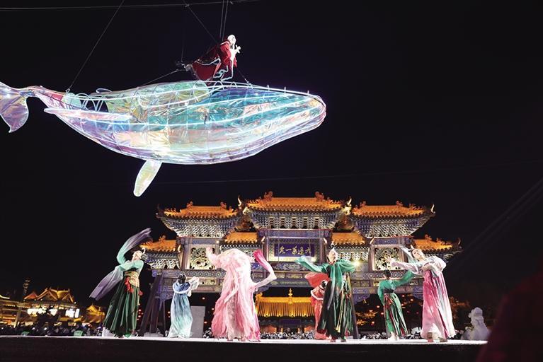 塞上老街旅游休闲街区的高空威亚秀。呼和浩特日报记者 王劭凯 摄